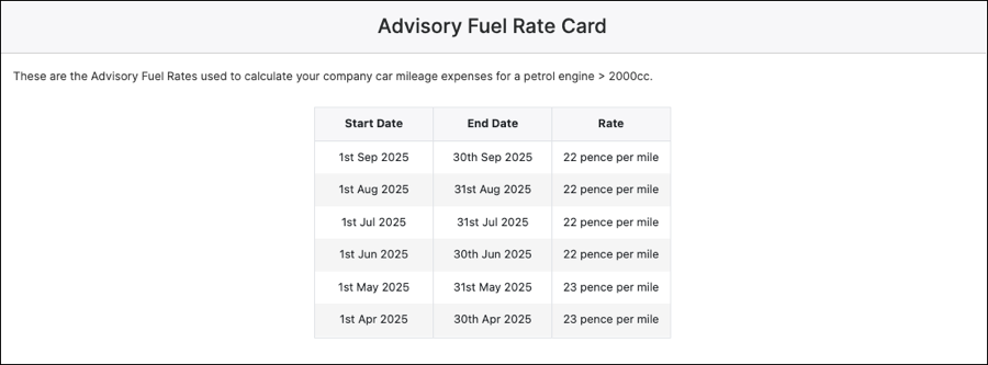When using HMRC rates, the Rate Card table will contain the rates that will be used by Tripcatcher. These cannot be changed.